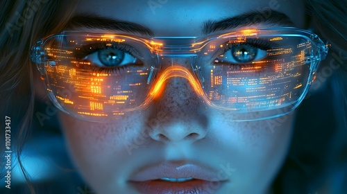 Close Up Person's Face Digital Circuit Patterns Overlay Sci-Fi Concept with Copy Space for Stock Photo