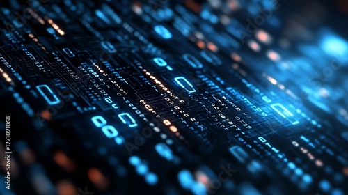 Close up view of digital data flow with glowing blue binary code and circuit patterns on a dark background : Generative AI