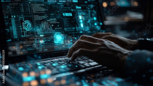 Close up view of hands typing on a computer keyboard with digital marketing analytics revenue graphs and ad campaign data displayed on the computer screen Concept of data driven decision making
