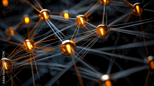 close up view of interconnected nodes and lines, representing data flow and connectivity network. glowing elements create