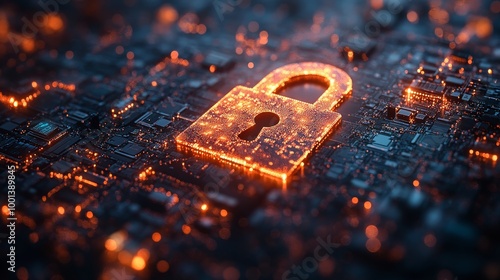 Closed padlock icon on a digital file, representing data protection, 3D illustration