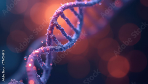 Close-up artistic rendering of a glowing DNA double helix with molecular detail and blurred bokeh lights in the background.