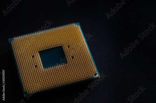 Closeup CPU pins on a green printed circuit board, Golden pins is The micro elements of computer central processor unit, objects isolated on Black background . GPU processor