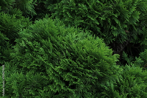 Closeup fresh green christmas leaves, branches of thuja trees on green background. Thuya twig occidentalis, evergreen coniferous tree. Chinese thuja. Conifer cedar thuja leaf green texture