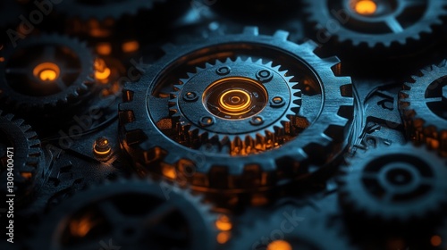 Close-up gears machinery complex system glowing orange