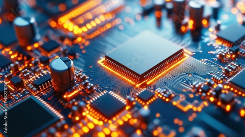 Closeup Illuminated Circuit Board Processor, Components, Technology, Electronics, Hardware, Digital,