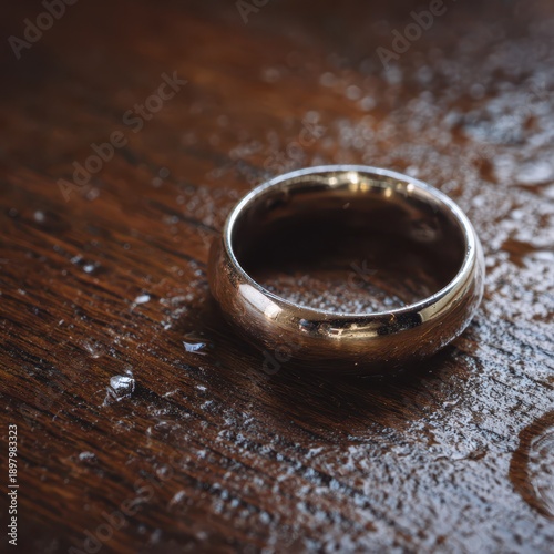 Close-up image of a metallic ring with reflective surface on a rustic background, diffused lighting