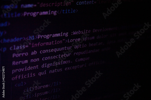 Closeup image of coding.Coding.Programming.Developing a webpage.Front-end development.Computer science.Programming languages.Web development languages.Front-end development languages.