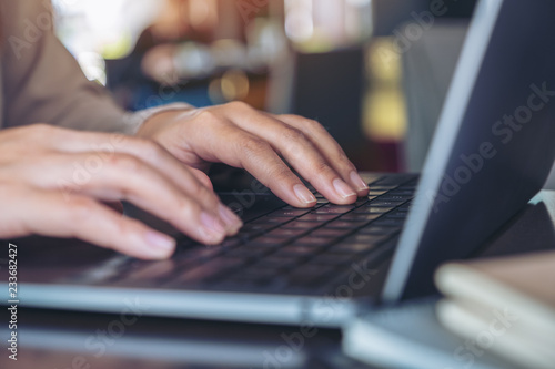 Closeup image of hands using and typing on laptop keyboard