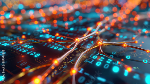 Close-up Neural Network with Glowing Connections and Binary Code Patterns