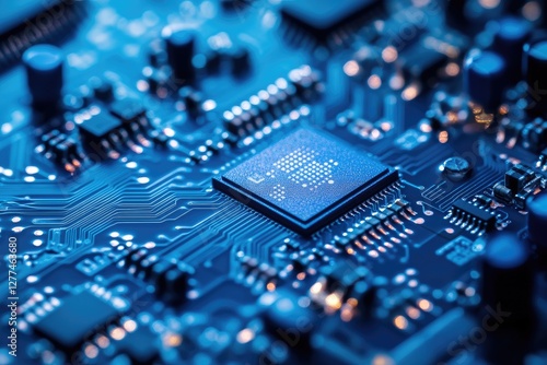 Close-up of a blue circuit board with a microchip and glowing circuits, symbolizing advanced technology and computing. Ideal for AI, data processing, and innovation concepts