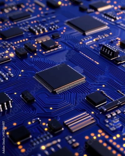 Close-up of a blue circuit board with multiple microchips and electronic components. High-resolution technology background.