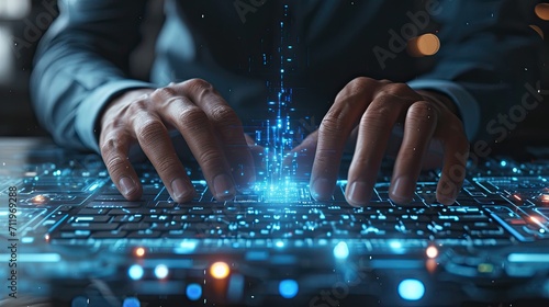 Close-up of a businessman's hands typing on a virtual command prompt, with AI ChatGPT interface, demonstrating advanced technology use. Created Using: macro photography, hands on virtual keyboard, AI