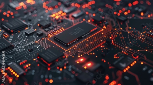 Close-up of a Circuit Board with Glowing Red Lines and Components