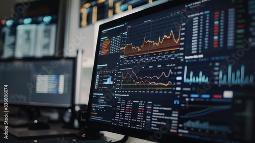 Close-up of a computer screen displaying real-time financial data and analytics graphs