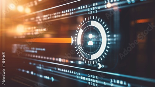 Close-up of a computer screen showing software update notification with progress bar, blurred code and technical icons, symbolizing software maintenance and security.