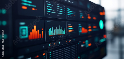 Close-up of a data analysis interface with graphs and metrics on a digital screen.