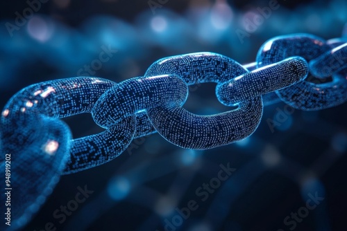 Close-up of a digital blockchain chain with glowing blue binary code.
