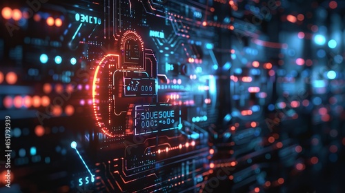 Close-up of a digital circuit board with glowing lights, depicting advanced technology and cybersecurity concepts.