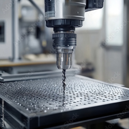 Close-up of a drill bit on a machining tool, showcasing precision and engineering in a workshop setting.