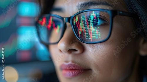 Close-up of a focused businesswoman analyzing stock market trends through glasses with colorful data reflections in a modern office setting.