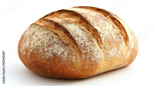 Close-up of a freshly baked loaf of bread with a golden crust, placed on a clean white background, highlighting its texture and rustic appearance.
