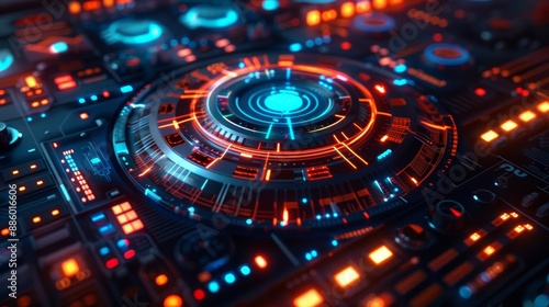 Close-up of a futuristic control panel with glowing blue and orange lights.