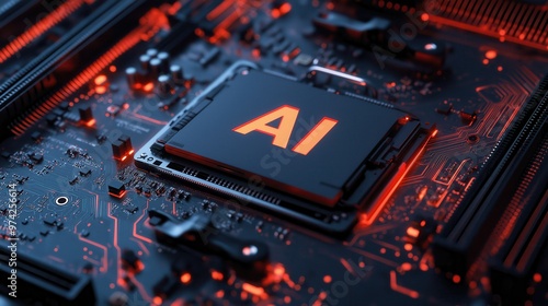 Close-up of a glowing AI microchip embedded in a futuristic circuit board, representing cutting-edge artificial intelligence technology, computing, and innovation in hardware design.
