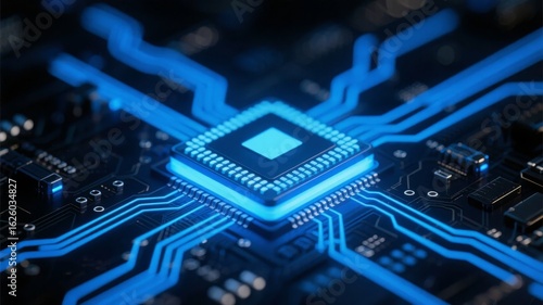 Close-up of a glowing blue microchip on a circuit board