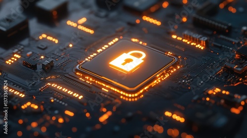 Close-up of a glowing cybersecurity icon on a dark abstract background with encrypted data, clean space for text.