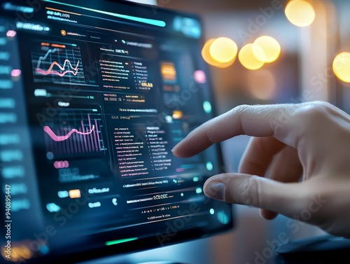 Close-up of a hand interacting with a digital data analytics dashboard on a high-tech touch screen, highlighting advanced technology and data visualization.