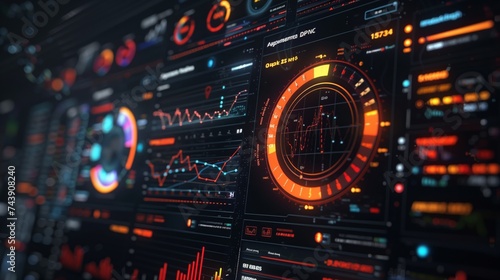 Close-up of a high-tech futuristic interface with glowing elements and complex data analytics visualizations.