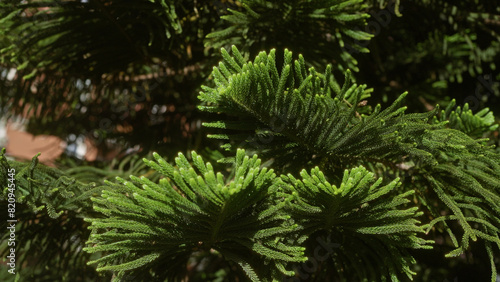 Close-up of a lush araucaria heterophylla, commonly known as norfolk island pine, in an outdoor setting in puglia, italy, highlighting vibrant green foliage.