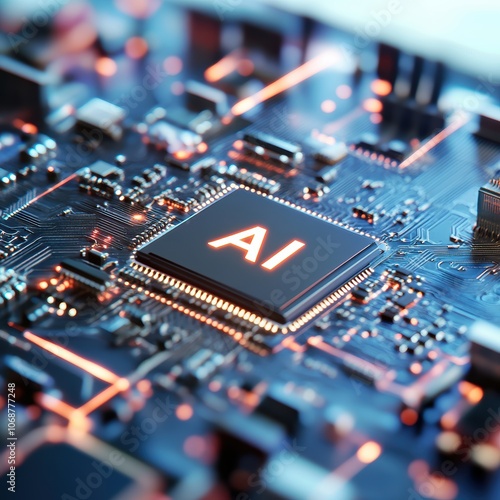 Close-up of a microchip with AI circuitry glowing in blue and orange tones.
