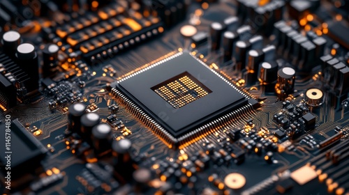Close-up of a microprocessor on a circuit board, showcasing intricate electronic components.