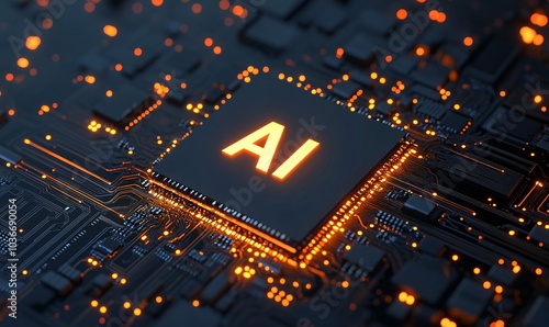 Close-up of a microprocessor with glowing 'AI' text, showcasing modern technology and artificial intelligence concepts in a dark circuit background.