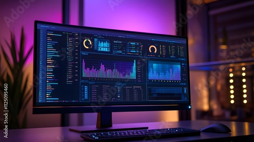 Close-up of a monitor showing real-time data from a distributed control system, soft ambient lighting creating an atmospheric effect.
