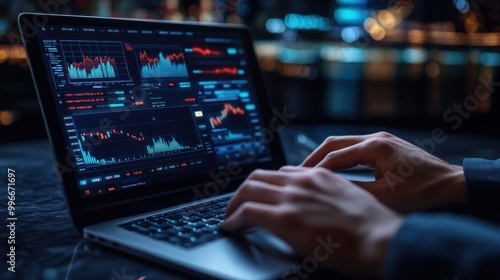 Closeup of a person's hands typing on a laptop with stock market charts displayed on the screen.