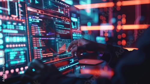 Close-up of a programmer working on computer code with multiple screens displaying colorful data in a high-tech environment.