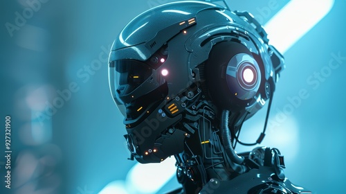 Close-up of a robotic head with a black helmet and glowing lights, against a blue background.
