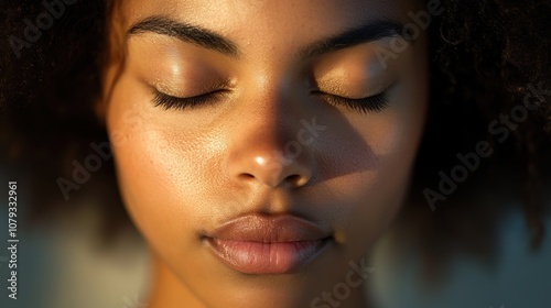 Close-up of a serene woman’s face with closed eyes, showcasing relaxed features and a calm expression, warm ambient light casting gentle shadows, emphasizing inner peace and tranquility.