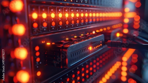 Close-up of a server rack with glowing LED lights indicating active operations in a data center environment.