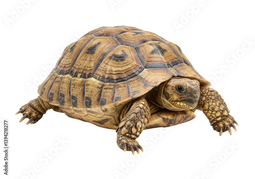 Close-up of a tortoise moving across a surface, showcasing its intricate shell patterns