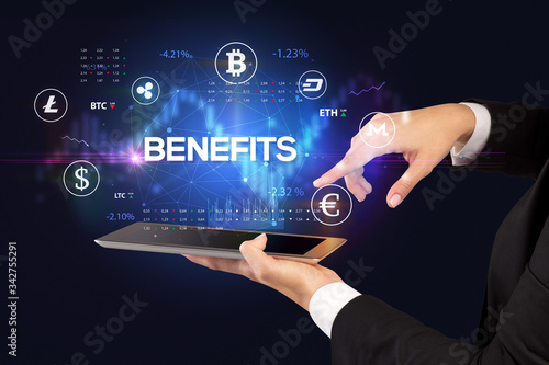 Close-up of a touchscreen with BENEFITS inscription, business opportunity concept