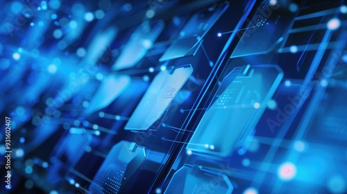 Close-up of abstract futuristic digital interface with blue glowing panels and data grids. Concepts of Compliance and Governance, innovation, and high-tech visualization.
