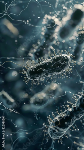 Close-up of bacteria under a microscope showcasing microscopic details and intricate structures in a surreal, aquatic environment.