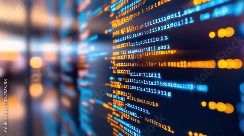 Close-up of binary code and digital data on computer screen. Technology and programming concept for cybersecurity and software development.