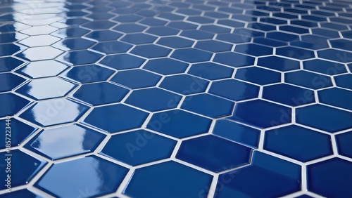 Close-up of blue hexagonal tiles with reflective surface
