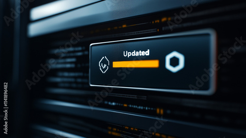 Close-up of computer screen showing software update notification with progress bar, blurred code and technical icons, symbolizing software maintenance and security.