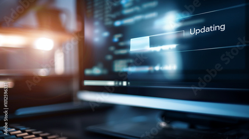 Close-up of computer screen showing software update progress bar with "Updating" text, keyboard and mouse visible in blurred background, modern technology and digital transformation concept.